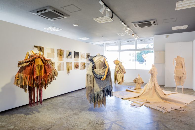 カフェテリア結では、ビニールや金属、紙、ゴミ処理される予定だった布の端や糸くず、髪の毛といった、服には使われない素材を使用した作品が集められ、梅林夕乃さん、大野知英さん、河原林美知子さん、久保李緒さん、内野菜摘さん、小角綾さん、加藤沙知さんの卒業生、教員7名による作品が展示されていました。