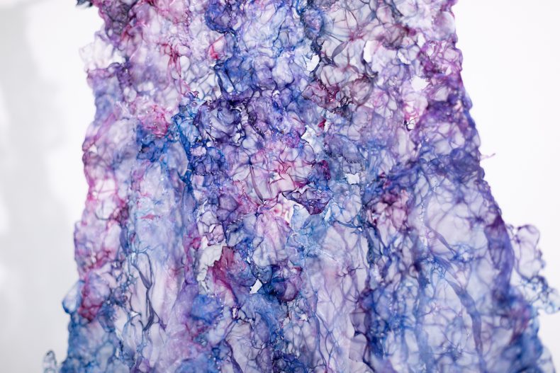 3名は、布を裁断して縫うのではなく、オーガンジーをあぶる、グルーガンで描く、モールを繋ぎ合わせるなど、それぞれの手法でテキスタイルを生み出し、服飾やオブジェ作品を制作。小さな素材を繋ぎ合わせて作られた作品は、完成までにどのくらいの時間が費やされたのでしょう。コツコツと積み重ねることで完成した美しい作品は、私たちの日常にある小さな営みの尊さを感じさせてくれるようにも思いました。